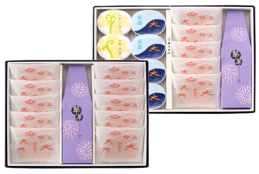 夏の夜空を照らす、大輪の花火をあらわした意匠羊羹「華華火」もお詰合せに。