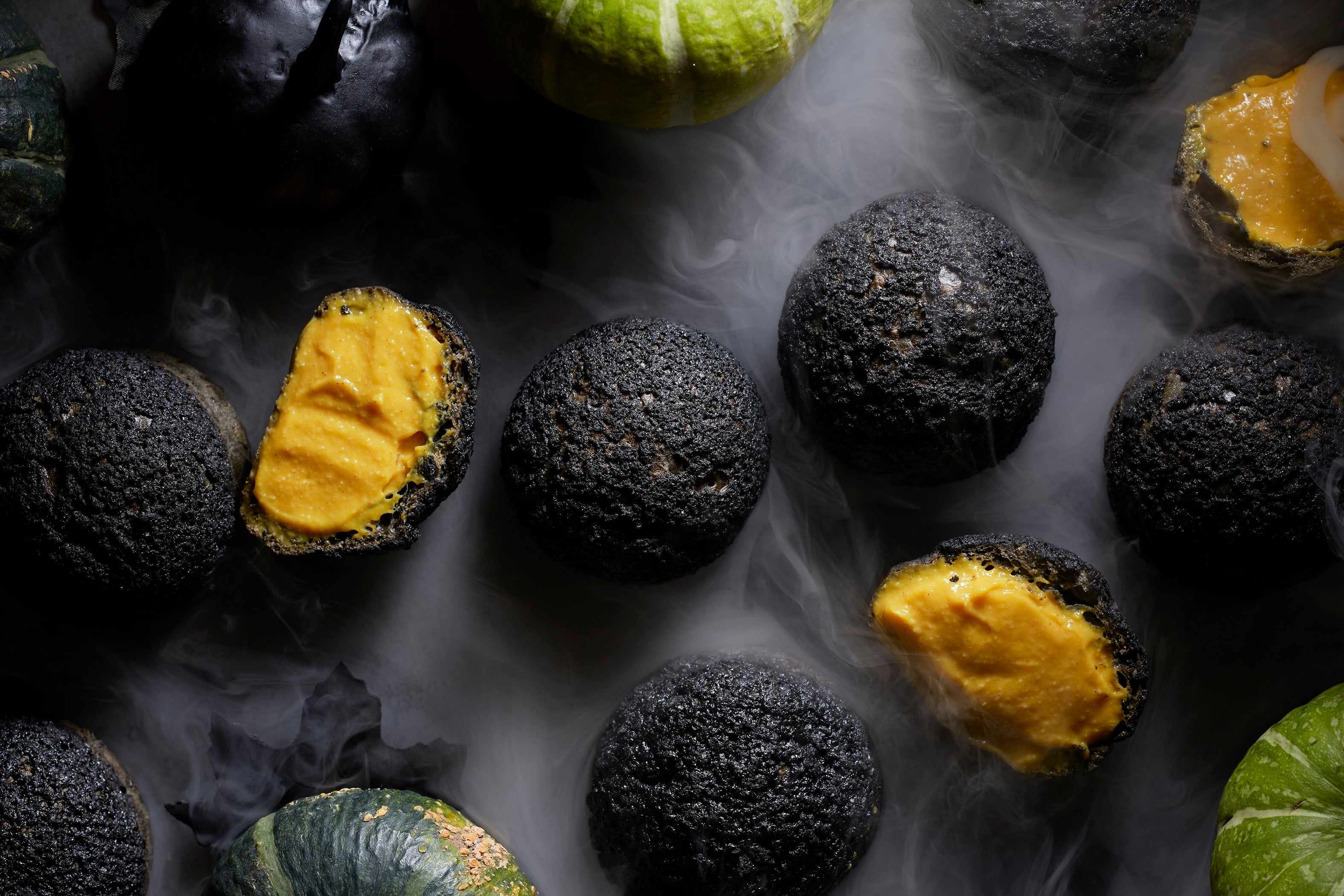 シュー生地と飾りつけのスパイスクッキーには竹炭を使用し、黒く焼き上げています。スパイスクッキーはシナモン、ナツメグを使用しアメリカンな味わいに仕上げました。シュークリームの中は、オーガニックシュガーとオーガニックバニラビーンズを使用し炊き上げたヘルシーなカスタードクリームに、かぼちゃを合わせたパンプキンカスタードをたっぷり詰めて、見た目も味わいもハロウィンを楽しむにはぴったりなスイーツとなっています。