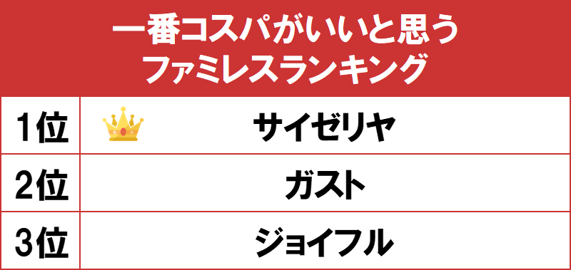 gooランキング(グーランキング)は、世の中のあらゆる「こと・もの」をランキング化する国内最大級のランキング情報サイトです。今回は、ファミリーレストランをテーマに、一番コスパが良いと思うのはどのファミリーレストランなのかについて調査・ランキング化しました。