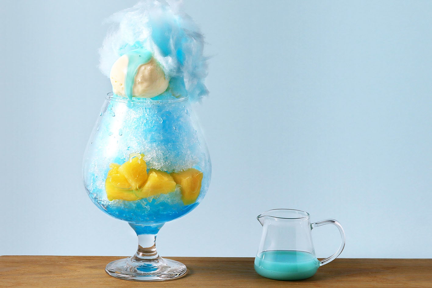 ブルーのドレスを着たサリーをイメージし、見た目にも涼しげなブルーハワイのかき氷。