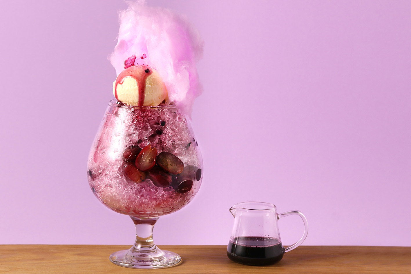 パープルカラーの女の子といえばバイオレット。ぶどう味のかき氷とグレープコットンキャンディーで彼女を表現しました。