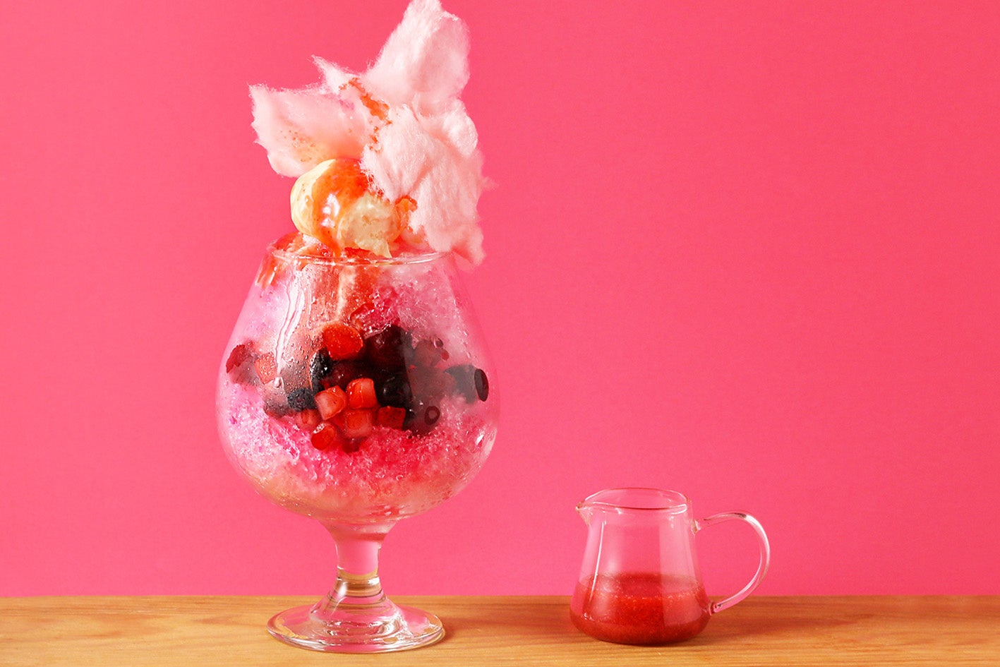 ふわふわなコットンキャンディーに別添えソースをかけて、不思議な食感をお楽しみください。
