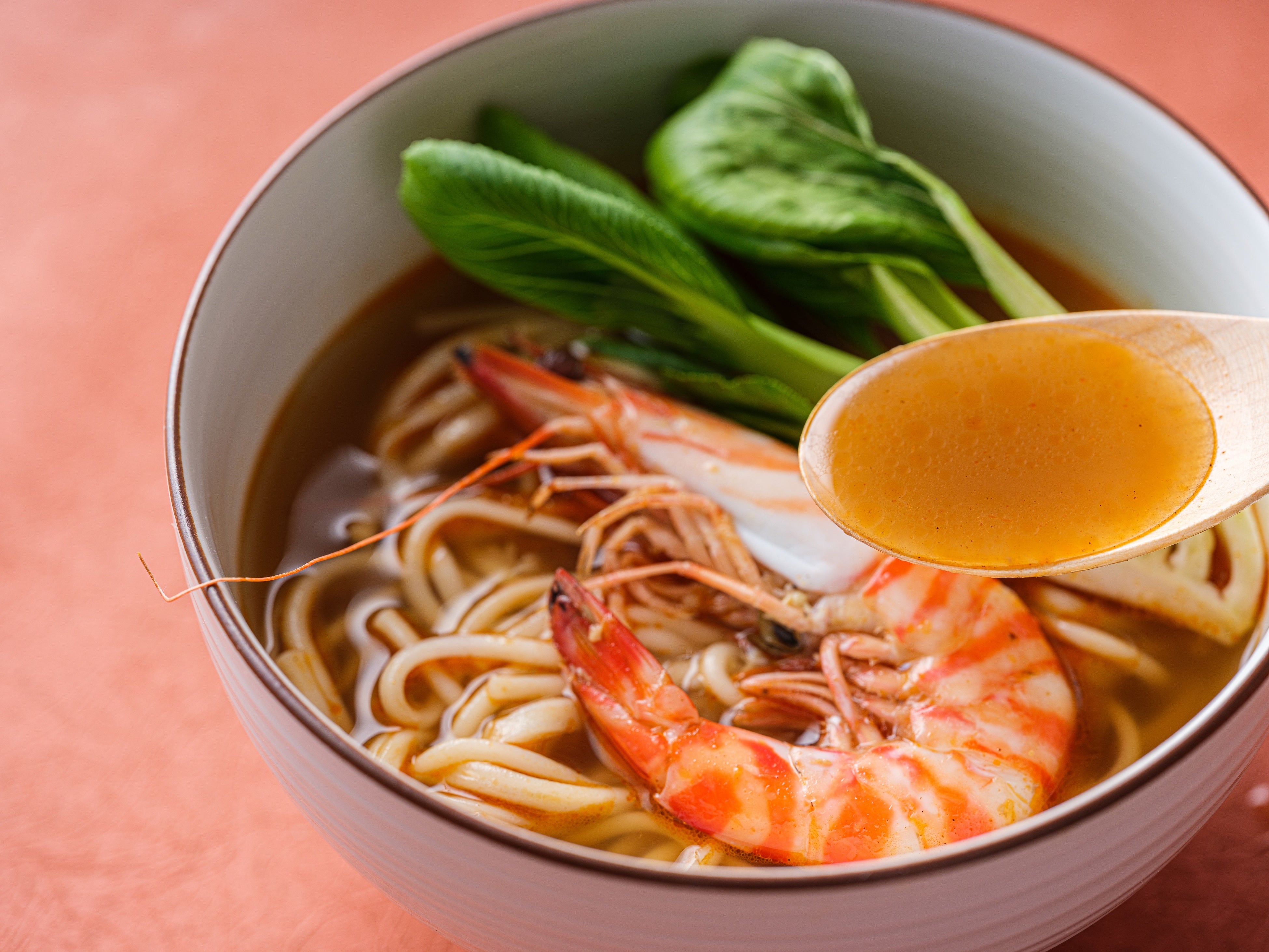 あごと焼き海老のスープをベースに、自家製の海老油とニンニク・黒胡椒・ショウガを配合した、ピリッとパンチのあるストレートタイプのうどんスープ。五島うどんをはじめ、フォーや春雨、ラーメンなどの麺とも相性の良い一品です。ご自身のお好きな麺と合わせてお召し上がりください。
