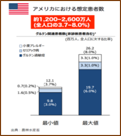 元来「グルテンフリー」は、グルテンアレルギー(小麦アレルギー)やセリアック病・グルテン過敏症などの自己免疫患者向けの食事療法でしたが、体調が優れない人が同様の食事療法を行ったところ、体調や肌状態の改善はもちろんのこと、ダイエット効果もあることから、近年欧米諸国では広まってきました。グルテン関連患者数は、アメリカで約1,200~2,600万人(全人口の3.7~8.0%)、ヨーロッパで約400~4,900万人(全人口の1.3~15.0%)に上り、農水省のデータによると、世界のグルテンフリー市場はアメリカや欧州を中心に順調に拡大しており、2024年には約100億USドルに達する見込みです。