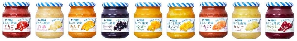 「まるごと果実」シリーズは2012年の発売以来、生のフルーツのようなみずみずしい果肉感、豊かな香りが市場に受け入れられ、現在では9種14品(いちご、白桃、あんず、ブルーベリー、マンゴー、オレンジ、いちじく、りんご、クランベリー)とラインアップが拡充しています。手軽に試せる小容量サイズと通常サイズの2つのサイズで展開します。