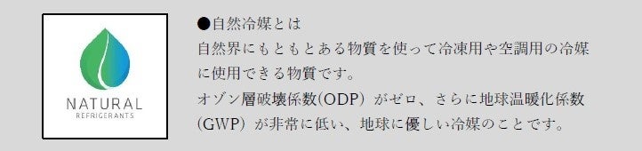 本製品は、地球環境に影響を及ぼす特定フロンや代替フロンに代えて自然冷媒を用いることで、従来製品に比べ地球温暖化係数(GWP)を約99%※2削減しました。
