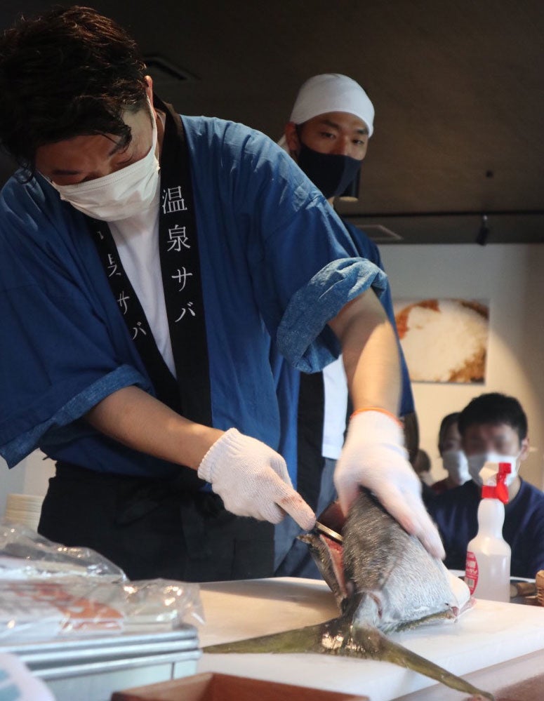 料理長が旬の魚を日本全国の市場から取り寄せ、お客さまの目の前でさばき、無料で振舞う毎月開催のイベントです。白寿の湯は敷地内でサバの陸上養殖に挑戦しており、イベントを通じて、地方の珍しい魚種の紹介や地域ならではの食べ方など、全国各地の食文化の発信も行っていきます。