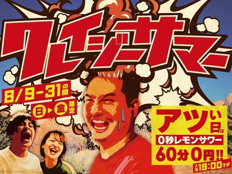 この度、開催する『クレイジーサマーキャンペーン』は、猛暑厳しい今夏を「0秒レモンサワー」で愉しく吹き飛ばしていただきたいと企画いたしました。期間中、19時までに入店されたお客様全員に、“アツい”日(ときわ亭調べ)は「0秒レモンサワー」60分550円を無料で提供いたします。なお、アプリ会員の方には朝9時にアプリメッセージにて事前に通知します。