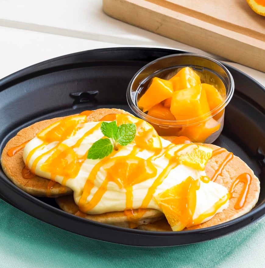 チーズカスタードクリームにオレンジ、マンゴーをたっぷりと盛り付け、甘酸っぱいオレンジソースをかけた夏らしい味わいのパンケーキです。