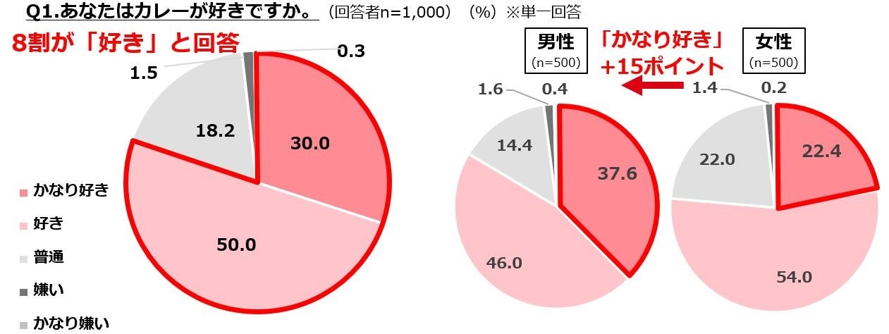 ・カレーを好きな人は8割。「かなり好き」は男性が女性を15ポイントほど上回る。