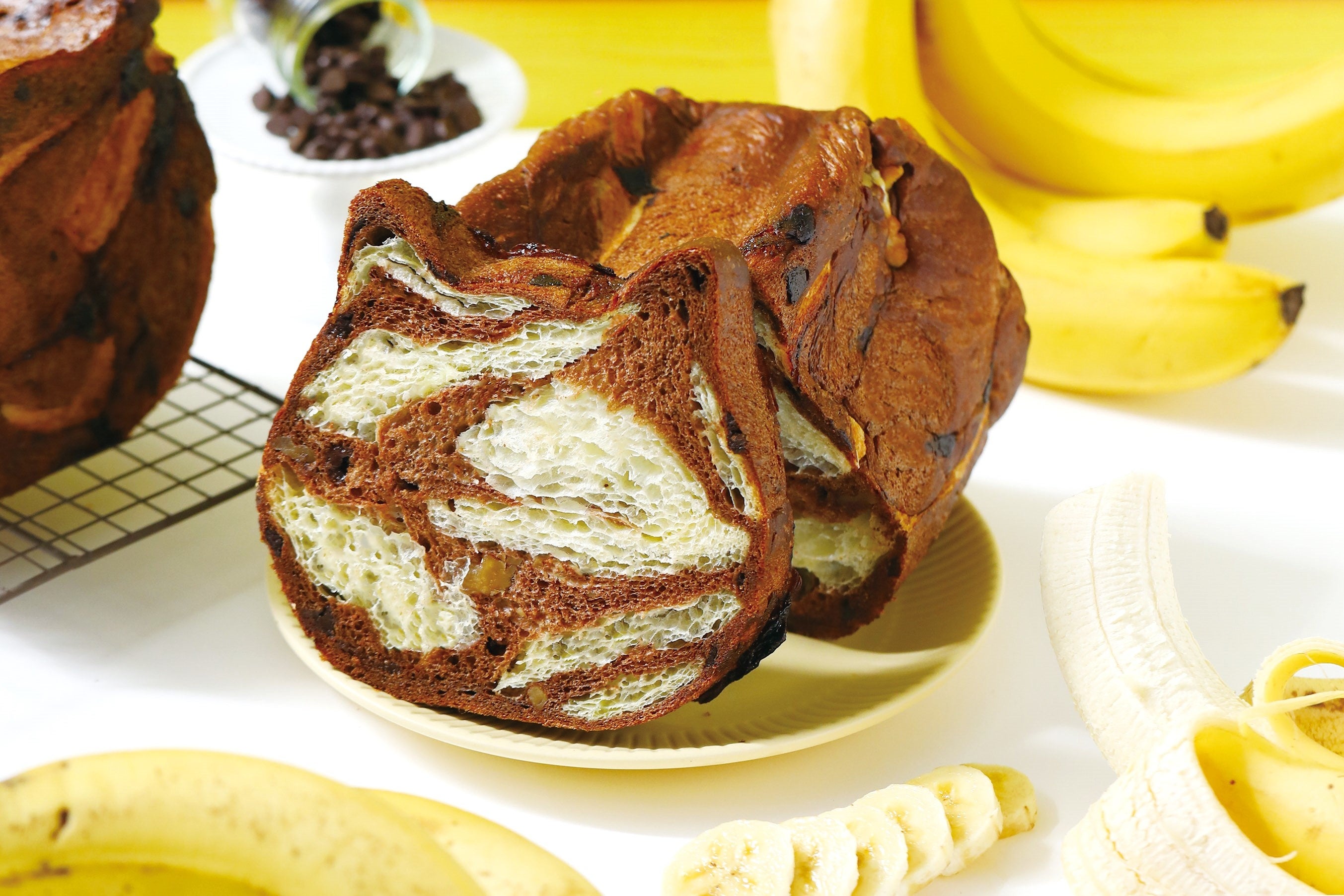 バナナ風味のデニッシュ生地と、くるみとチョコチップを混ぜ合わせたねこねこ食パンのチョコ生地の間にバナナソースを織り込んで焼き上げました。