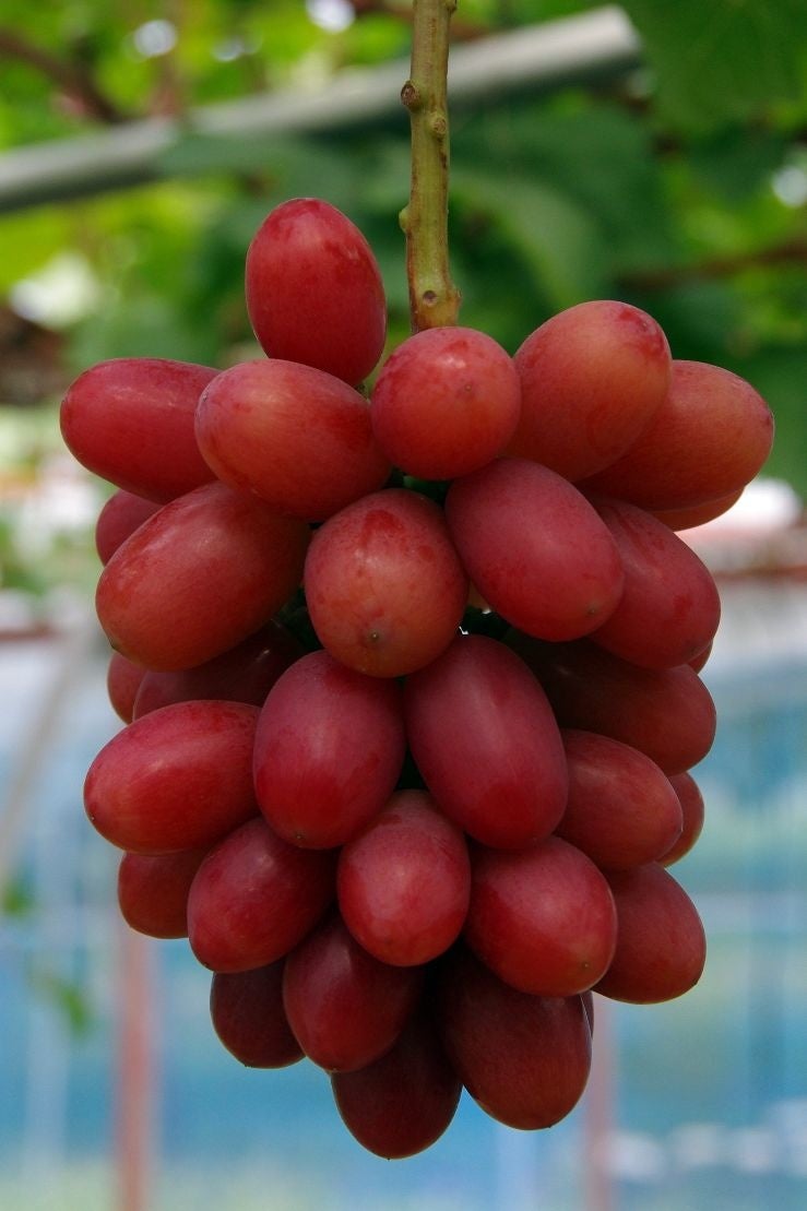鮮やかな紅色で、独特なマスカットの香りと、ぱりっとした歯応え、糖度20度以上の甘さが特徴。種なしで皮ごと食べられる。