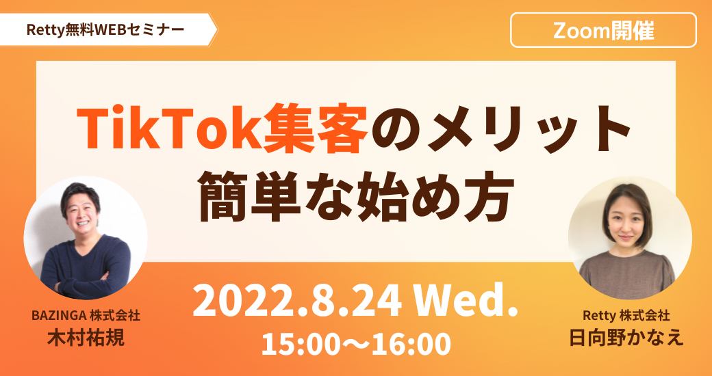 実名口コミグルメサービス「Retty」を運営するRetty株式会社(本社:東京都港区、代表取締役:武田 和也、以下Retty)は、飲食店向けWebセミナー「TikTok集客のメリットと簡単な始め方」を8月24日(水)15:00〜16:00で開催します。Rettyは飲食店のみなさまがよりよい集客を実現しHappyな食体験を生み続けられるよう、サポートしてまいります。