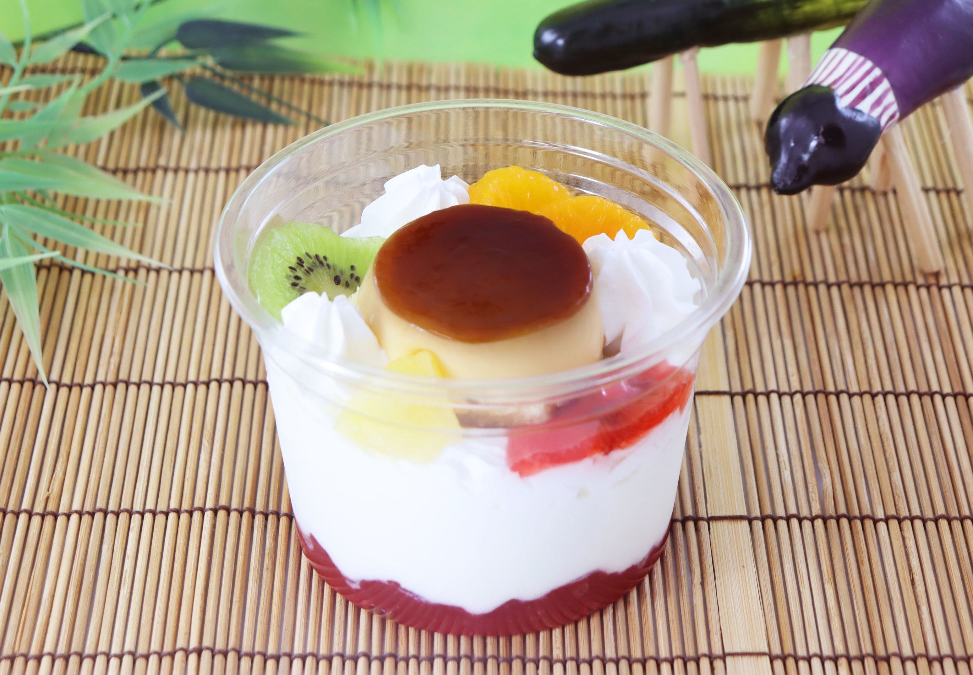 プリンとみかん・パイン・キウイ・苺ダイスをトッピングしたボリュームたっぷりのプリンアラモードです。トッピングのプリンは固めの甘い卵プリンで、さわやかなフルーツとの相性が良く、苺ゼリーを最下層に仕込むことで、底まで味わいの変化を楽しめる仕立てです。また、重量350g以上の大容量サイズなので、お盆に家族で分け合って食べていただくのも、おひとりで贅沢に食べていただくのもオススメなスイーツです。