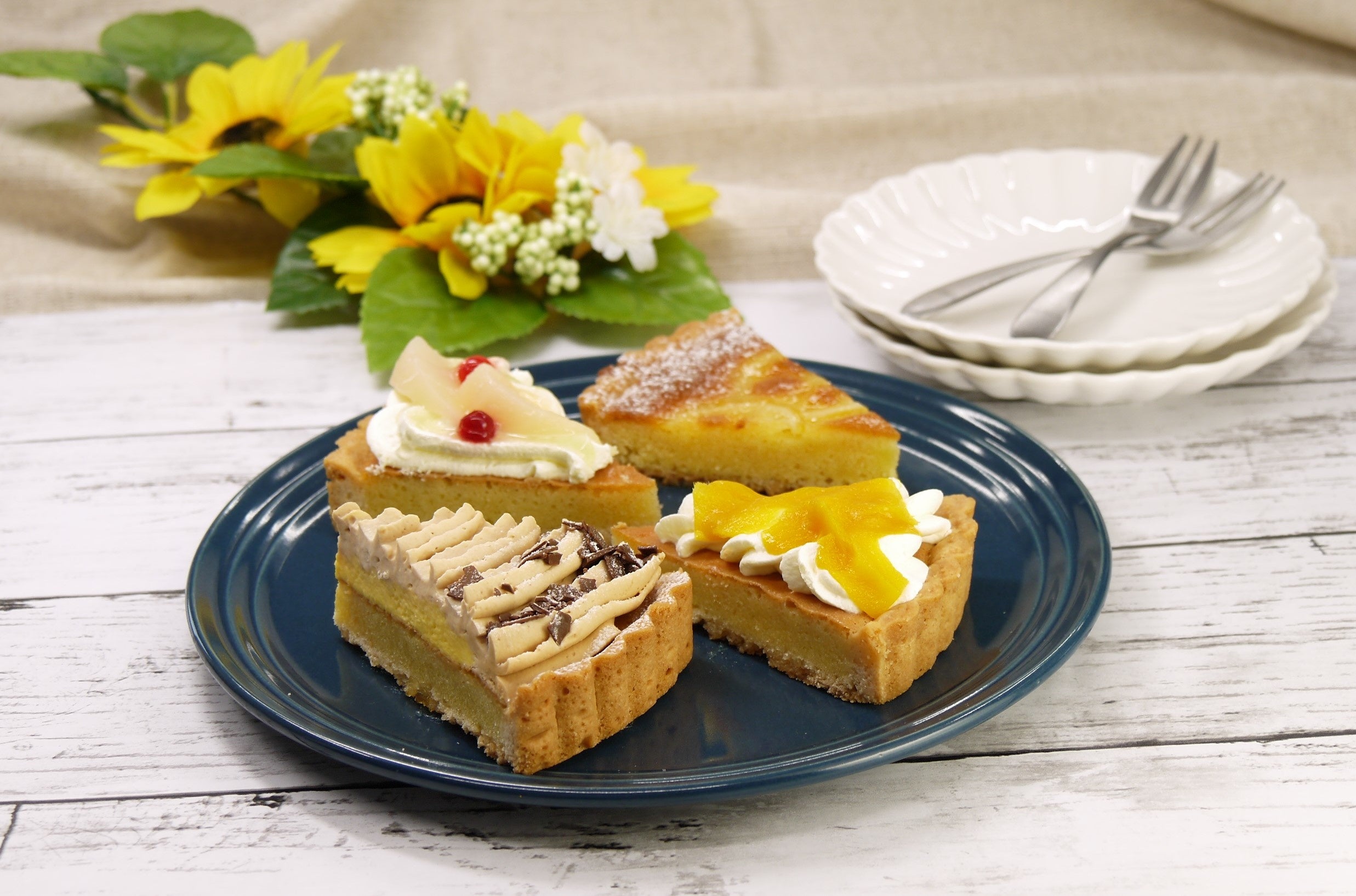 イタリア栗を使用したモンブランタルト、マンゴー果肉をトッピングしたマンゴータルト、レモンスライスと一緒に焼き込んだはちみつレモンタルト、爽やかなシャインマスカットソースと白桃果肉をトッピングしたオリジナルタルトの4種を詰め合わせた、家族みんなで分け合える季節感いっぱいのタルトセットです。