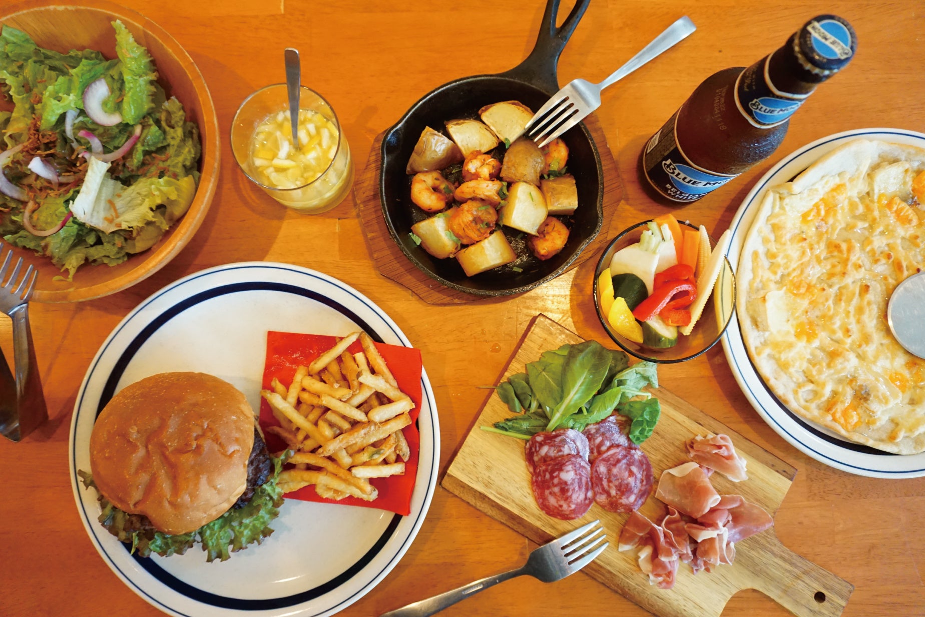 ハンバーガーはもちろんながら、米粉100%使用の自家製生地のピザや、特製スパイスで仕上げたガーリックシュリンプやタコスなど、バラエティ豊富なフードラインナップ。