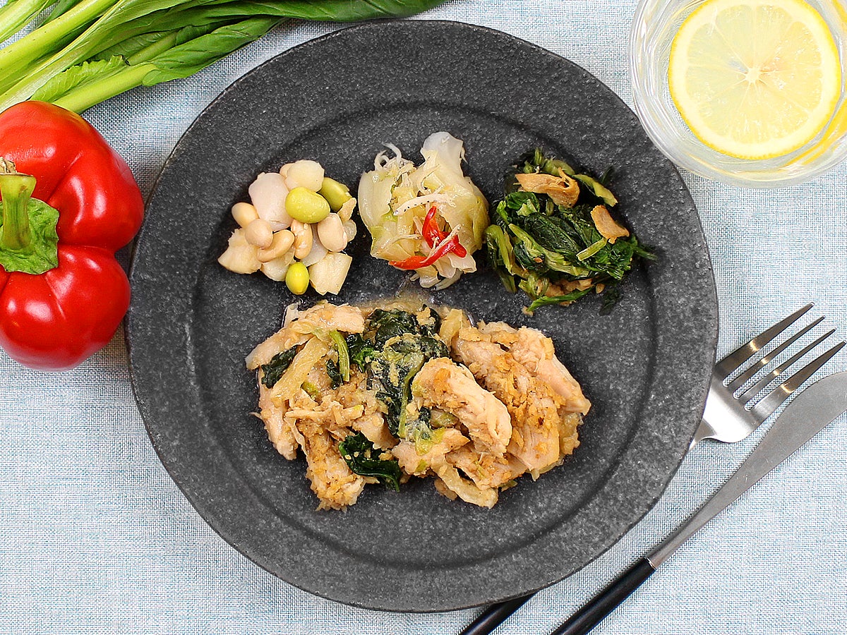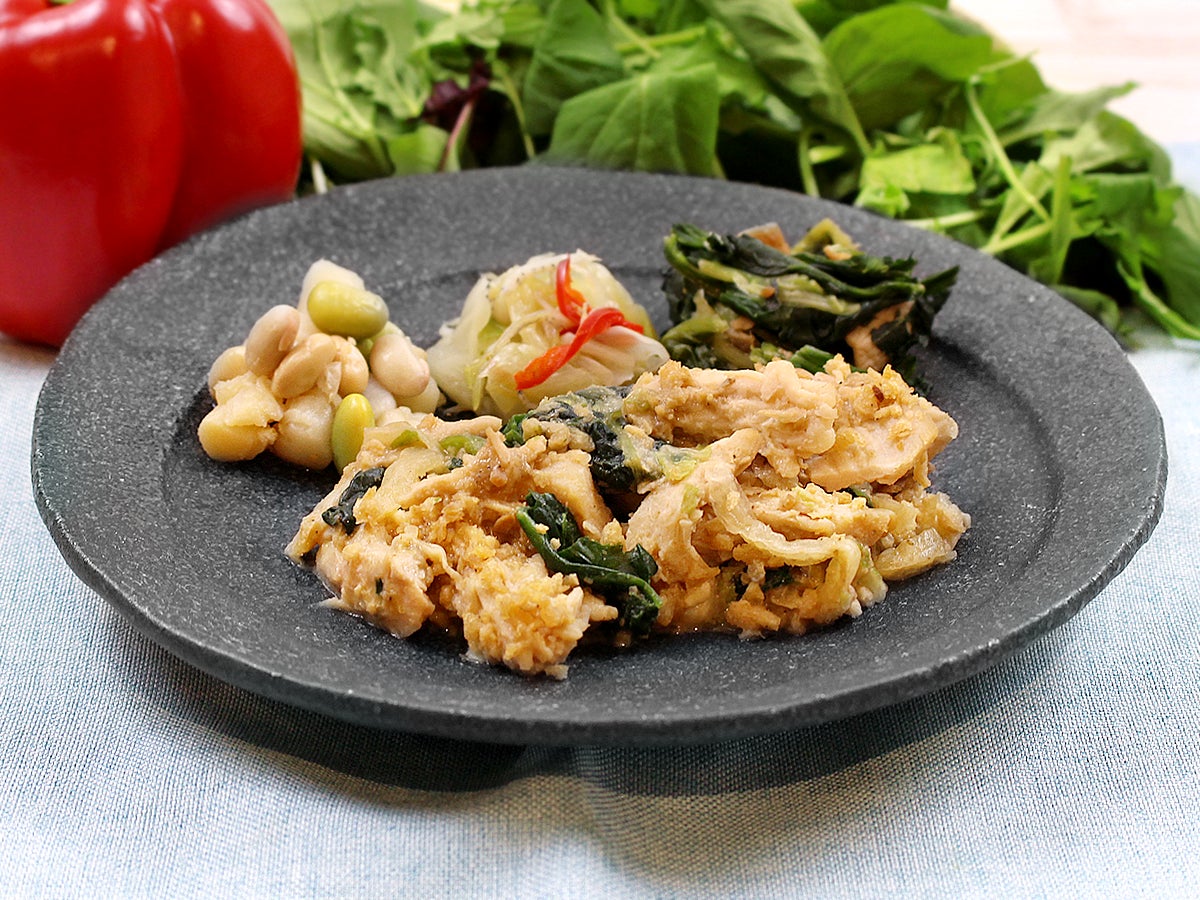 焙煎ごまだれの香りが食欲をそそる棒棒鶏をご用意いたしました。白菜とほうれん草の上に、ほぐした蒸し鶏をのせて大豆ミートをアクセントに盛り込みました。サラダのように召し上がれる一品となっております。よく混ぜてお召し上がりください。