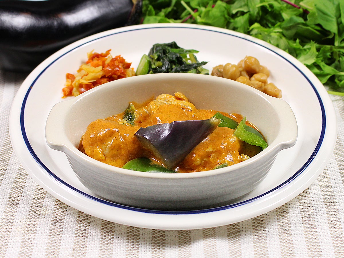 副菜はカレーと相性のよいトマトマリネ、ネバネバ食感が特徴のオクラを使用したモロヘイヤサラダ、アーモンドがアクセントになったひよこ豆のソテーです。