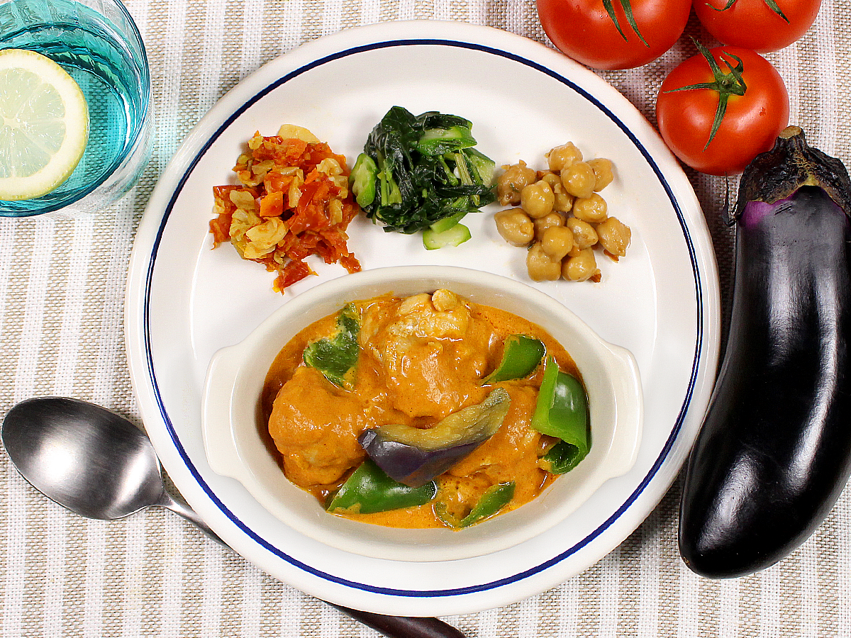 マイルドでコク深いバターチキンカレーのプレートです。香味野菜やスパイスとバター、鶏肉の旨味が一体となり食欲をそそります。具材にはピーマンと茄子を使用しております。
