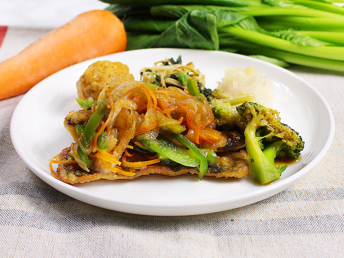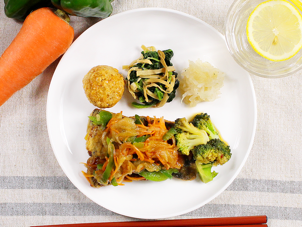 イワシの竜田揚げに黒酢あんをかけました。カリッと揚げたイワシの上にスイートチリソースでマリネした、たっぷりの細切り野菜をのせております。香り豊かな黒酢とピリ辛の野菜は相性抜群です。