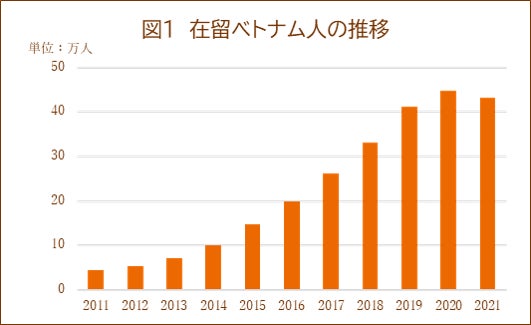 法務省の出入国在留管理庁が発表した2021年末時点における在留外国人数に関する統計によると、日本における在留外国人数は276万635人。このうち、在留ベトナム人は約43.2万人います。2020年の統計では、上位10か国・地域のうち、ベトナムのみが増加(対前年末比3万6,085人<8.8%>増)しており、中国に次いで第2位になりました。2011年は4万人程度だったのが、10倍以上に増えています。