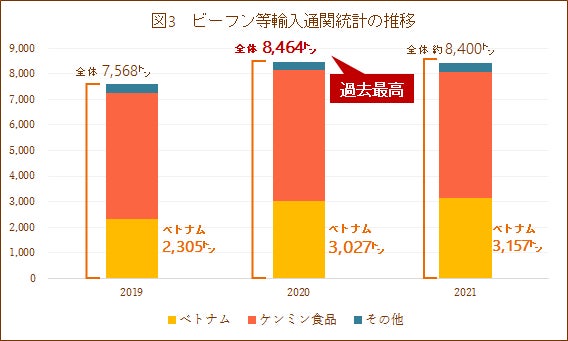 これに比例するように、財務省が作成した通関統計では、フォーが主体のベトナムからの輸入額は、2019年は約2,305トンだったのに対し、2020年には約3,027トンと大幅に増加。ビーフンやフォーなど米粉の麺類の全体の輸入額をみてみても、同期間で7,568トンから8,464トンとなり、2020年には過去最高になったとの調査を横浜税関がまとめています。(※図3ビーフン等輸入通関統計の推移)