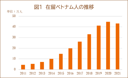 法務省の出入国在留管理庁が発表した2021年末時点における在留外国人数に関する統計によると、日本における在留外国人数は276万635人。このうち、在留ベトナム人は約43.2万人います。2020年の統計では、上位10か国・地域のうち、ベトナムのみが増加(対前年末比3万6,085人<8.8%>増)しており、中国に次いで第2位になりました。2011年は4万人程度だったのが、10倍以上に増えています。
