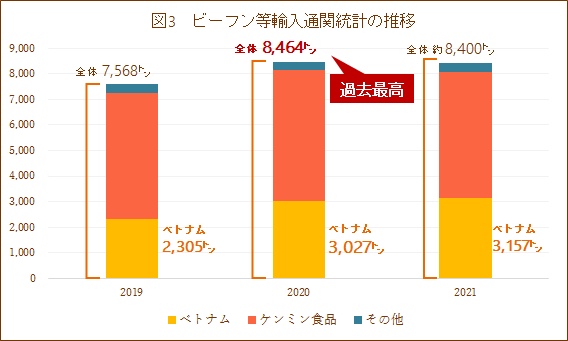 これに比例するように、財務省が作成した通関統計では、フォーが主体のベトナムからの輸入額は、2019年は約2,305トンだったのに対し、2020年には約3,027トンと大幅に増加。ビーフンやフォーなど米粉の麺類の全体の輸入額をみてみても、同期間で7,568トンから8,464トンとなり、2020年には過去最高になったとの調査を横浜税関がまとめています。(※図3ビーフン等輸入通関統計の推移)