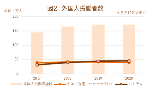 厚生労働省が発表した「外国人雇用状況」の届出状況まとめ(令和3年10月末現在)をみてみると、外国人労働者数は約173万人。国籍別では、ベトナムが最も多く453,344 人 (外国人労働者数全体の26.2%)、次いで中国 の397,084 人 (同23.0%)となっています。(※図2:外国人労働者数)