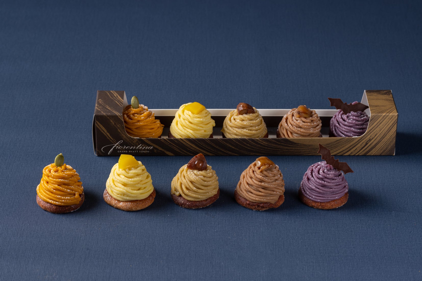 紫芋でつくる新作の“ヴィオーラ”、国産の生栗を煮てつくるこだわりのマロンクリームが特徴の“フレスコ”、栗本来の甘さと風味が味わえるフランス産の栗のペーストで仕上げる“フランシア”、熊本県産の栗を渋皮ごとつかった濃厚なマロンクリームを贅沢につかった“ジャポネーゼ”、そして素材の味を活かした優しい甘さの“パンプキン”の5種類を一口サイズにした、モンブランの食べ比べができる嬉しいセットです。