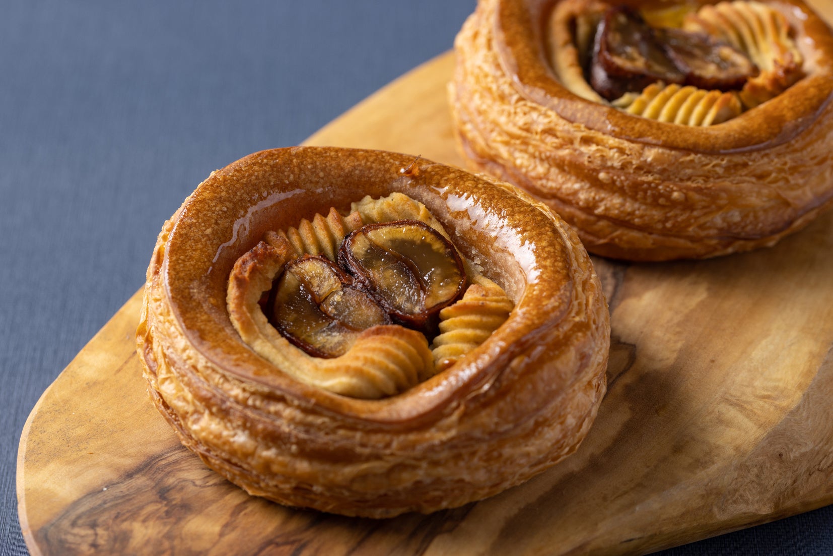 シナモンパウダーを練り込んだクロワッサン生地に、自家製の国産栗ペーストやカスタードクリームを合わせたアーモンドクリームを絞り、渋皮付きの和栗をトッピングして焼き上げます。サクサクとしたシナモン香る生地に栗の優しい甘さがよく合うデニッシュです。