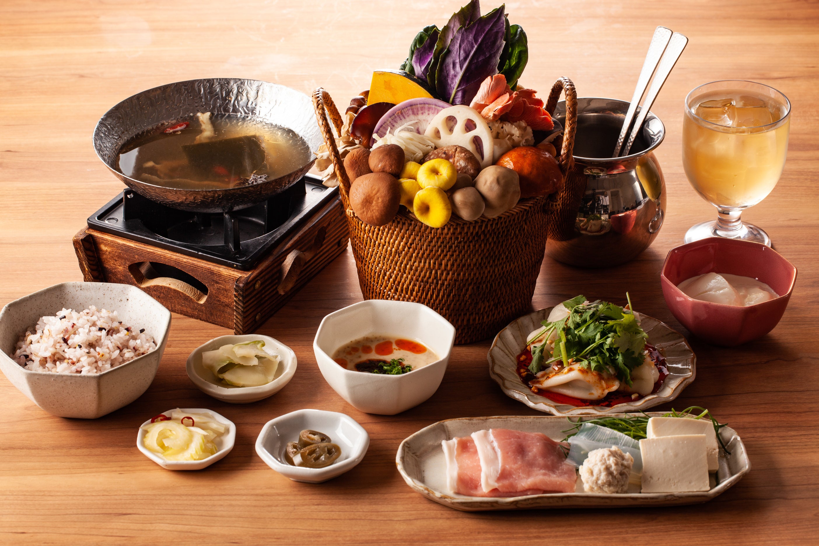 「裏の山の木の子」の看板メニュー「薬膳きのこ火鍋(白のスープ)」をひとり鍋で、大変お得に楽しむことができる、ランチ限定のセットです。