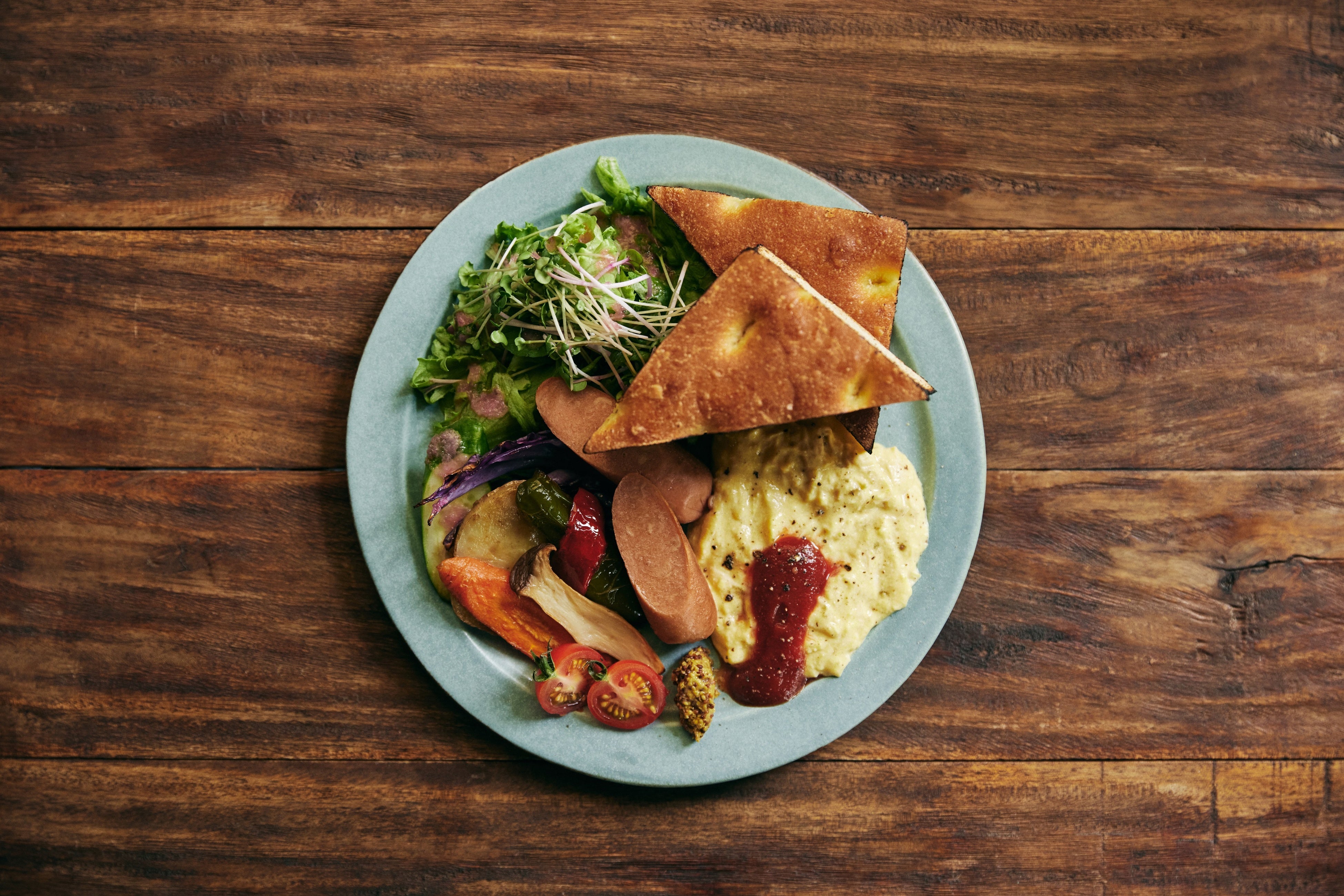 100%植物性のモーニングプレート。動物性食材を一切使用せずに、スクランブルエッグの味、食感を再現しました。タンパク質も野菜もしっかりと摂取することができる、1日のはじまりを充実させてくれる一皿です。提供時間:8:00~15:00