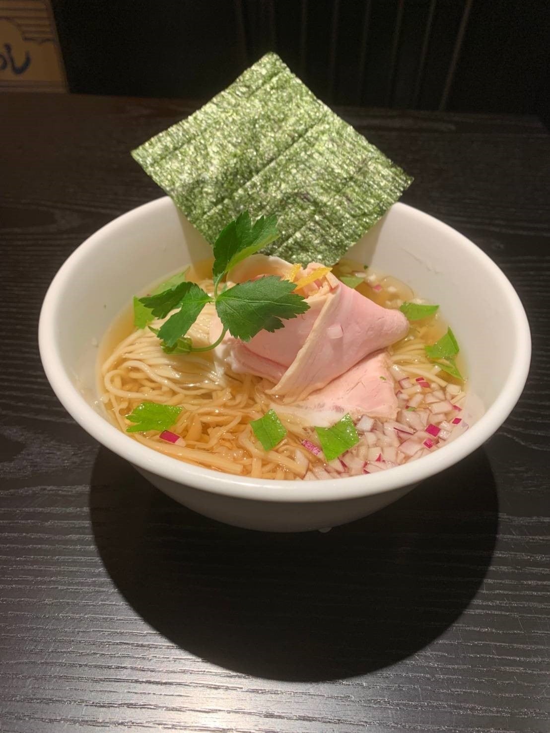 さっぱりと冷やしでいただく、澄んだスープが特徴の和風ラーメン。和歌山の湯浅醤油の白醤油と数種類の醬油をブレンドして一昼夜漬け込んだ煮干し出汁と、北海道産小麦「春よ恋」を使用した旨味溢れる麺の相性は抜群です。トッピングの自家製玉ねぎオイル、刻み柚子、大葉がさわやかな香りを添え、煮干し出汁の芳醇な風味を引き立てます。