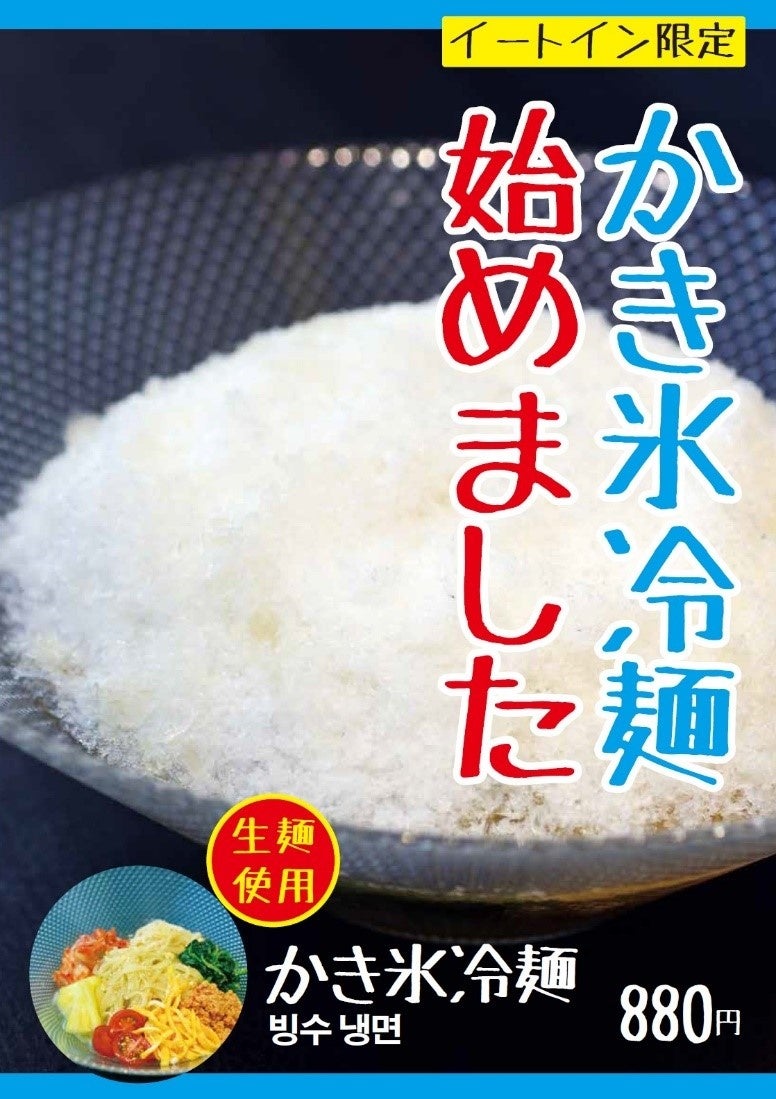 具が見えないほどのかき氷が贅沢に乗った、涼しさ満点の冷麺。まるで皿の中に雪が降ったかのような清涼感で、見た目から楽しい一皿です。