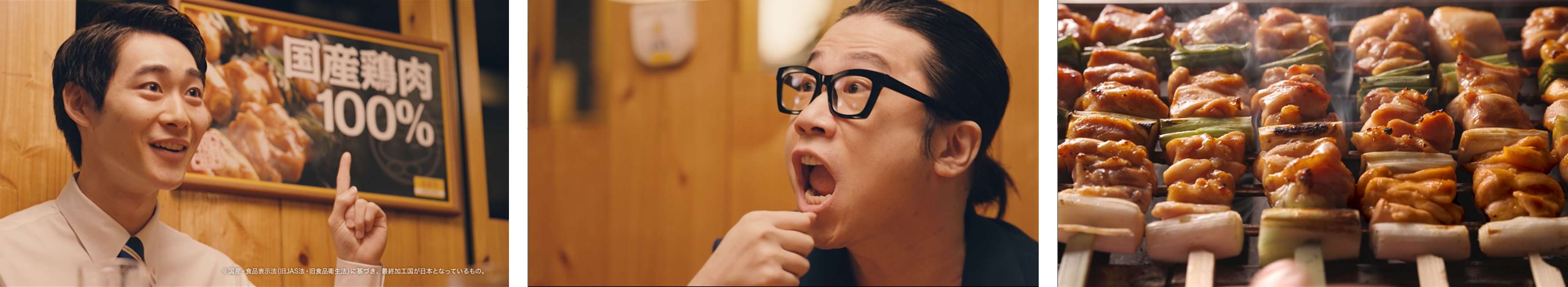 先輩社員が「老舗の焼鳥屋ってのは、国産なわけよ。」と知ったかぶりを発揮。直後に国産鶏肉100%のポスターが映され、後輩男性による「国産ですよ!鳥貴族も。」と知られざるこだわり話で先輩を論破します。