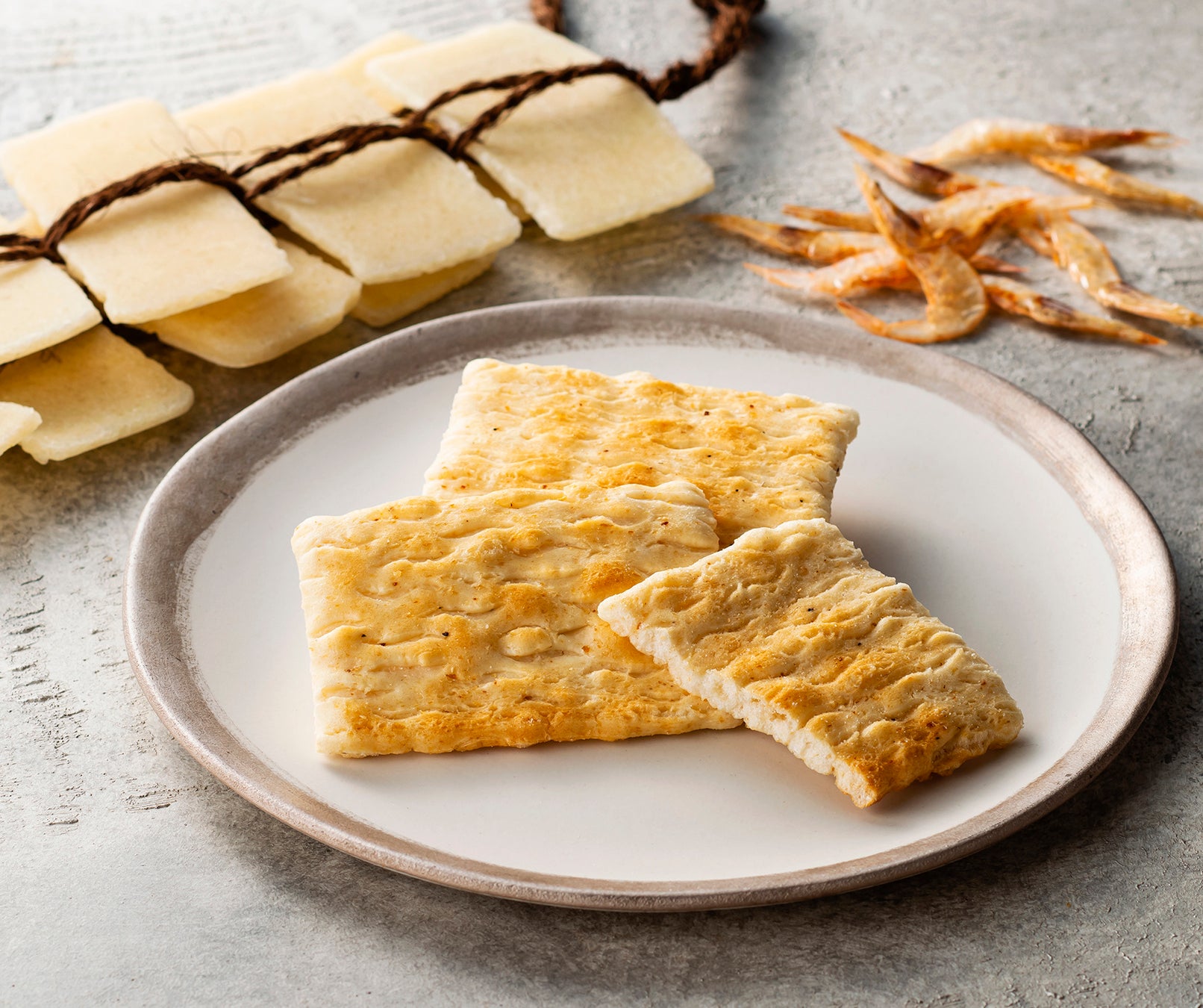富山湾の宝石「しろえび」を、富山米100%の生地にたっぷりと練りこみました。パリッとした食感の塩味ベースのしろえびせんべいをオリーブオイルとほのかな酸味で上品な味に調えました。
