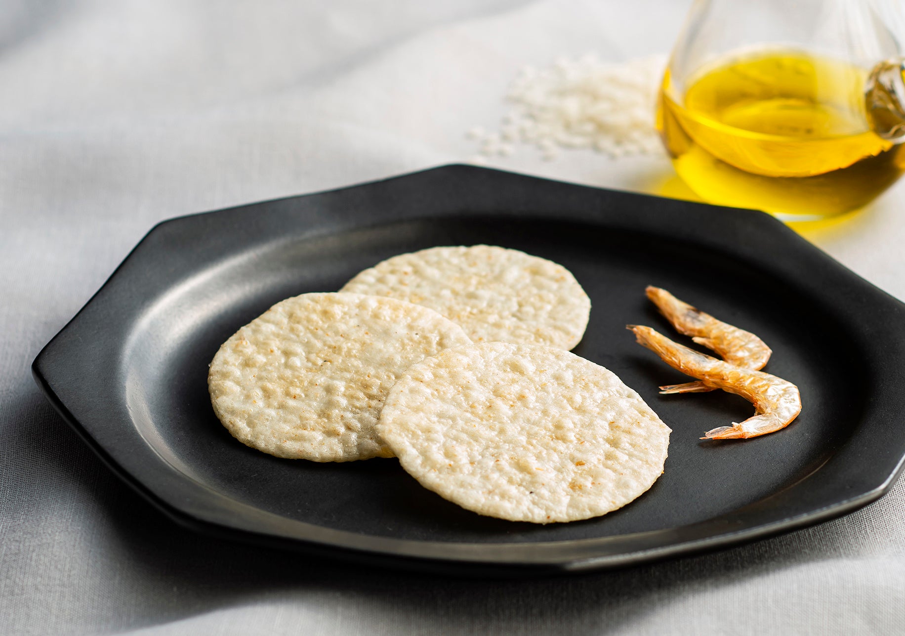 富山湾の宝石「しろえび」を、富山米100%の生地にたっぷりと練りこみました。パリッとした食感の塩味ベースのしろえびせんべいをオリーブオイルとほのかな酸味で上品な味に調えました。