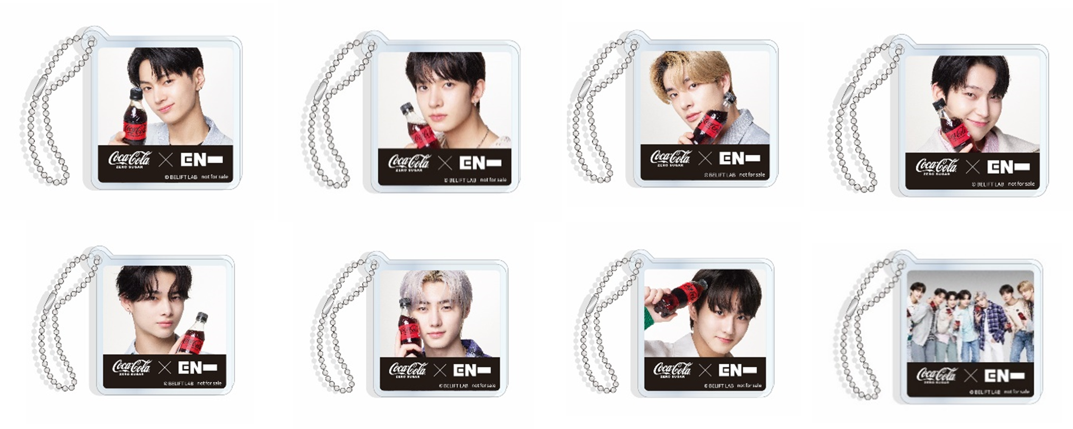 期間中に、コンビニエンスストアで対象製品を2本購入※すると、撮りおろし写真がデザインされ たオリジナルデザインのアクリルキーホルダーがもらえます。全部コレクションしたくなる、メンバー7種+グループ1種の全8種で展開します。また、景品の包装内部に印刷された二次元コードをスマートフォンから読み込み、キャンペーンサイトにアクセスして参加すると抽選で1000名様にENHYPENスペシャルイベント(オンライン参加)が当たるほか、応募完了後には「コカ・コ ーラ ゼロ×ENHYPENオリジナルスマホ壁紙」がもれなくもらえます。