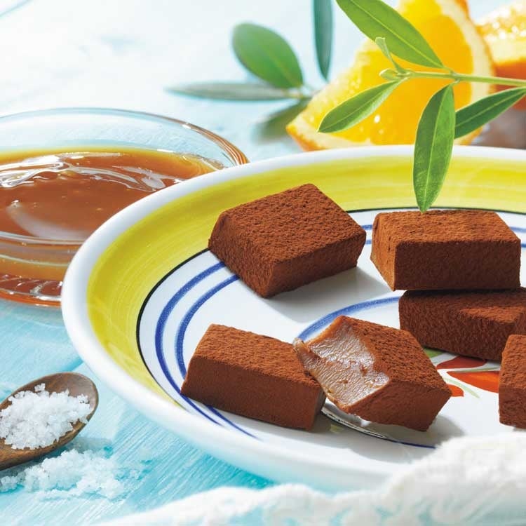 キャラメル風味のチョコレートにフランス・ブルターニュ地方名産の「ゲランドの塩」を効かせ、生クリームとオレンジピューレを加え、バニラとオレンジのお酒で風味付けしました。キャラメルのまろやかな甘さにゲランドの塩がアクセントになっています。オレンジのさわやかな風味で、さっぱりとした後味に仕上げました。