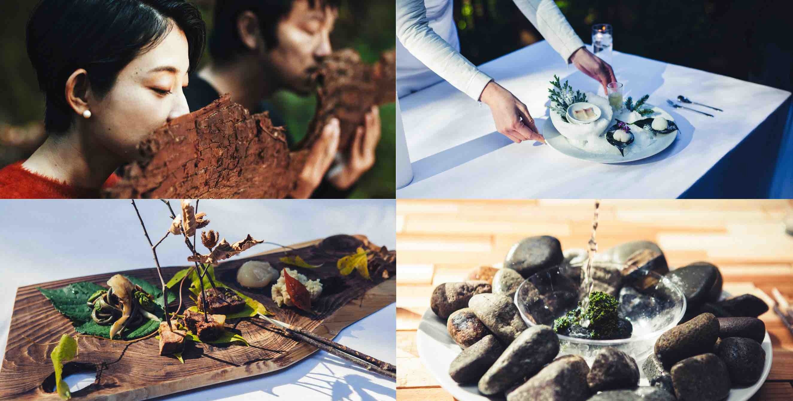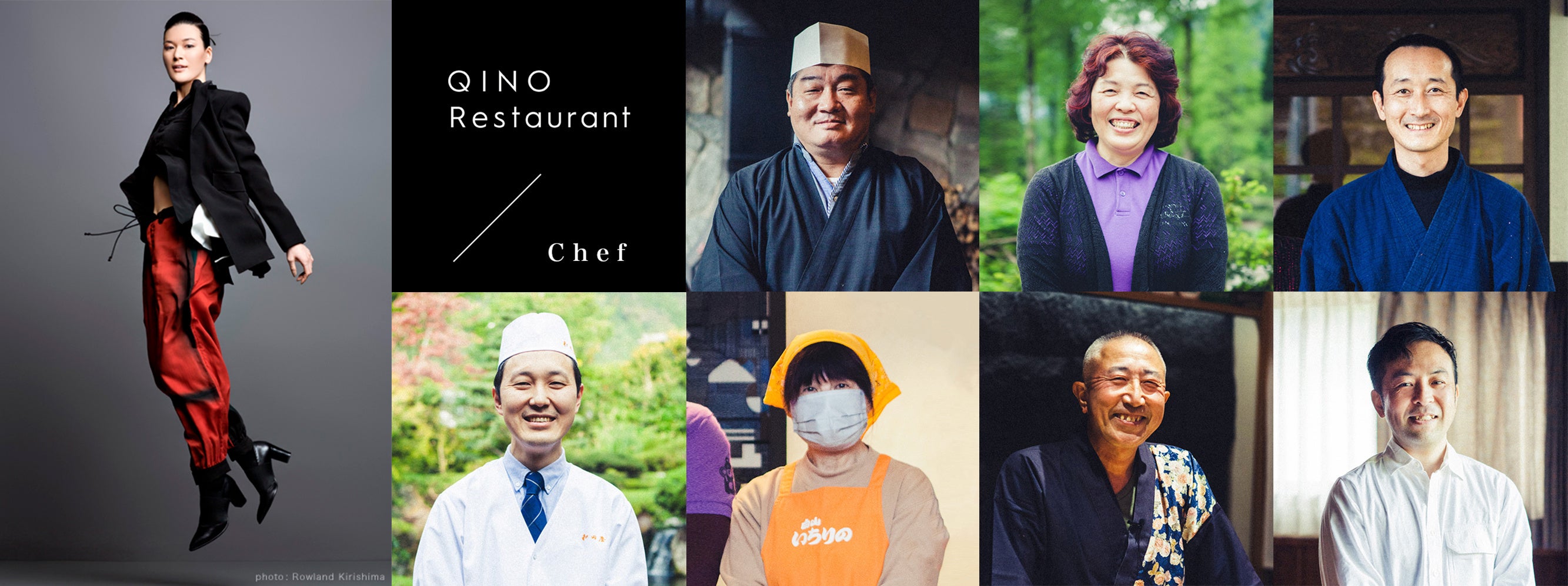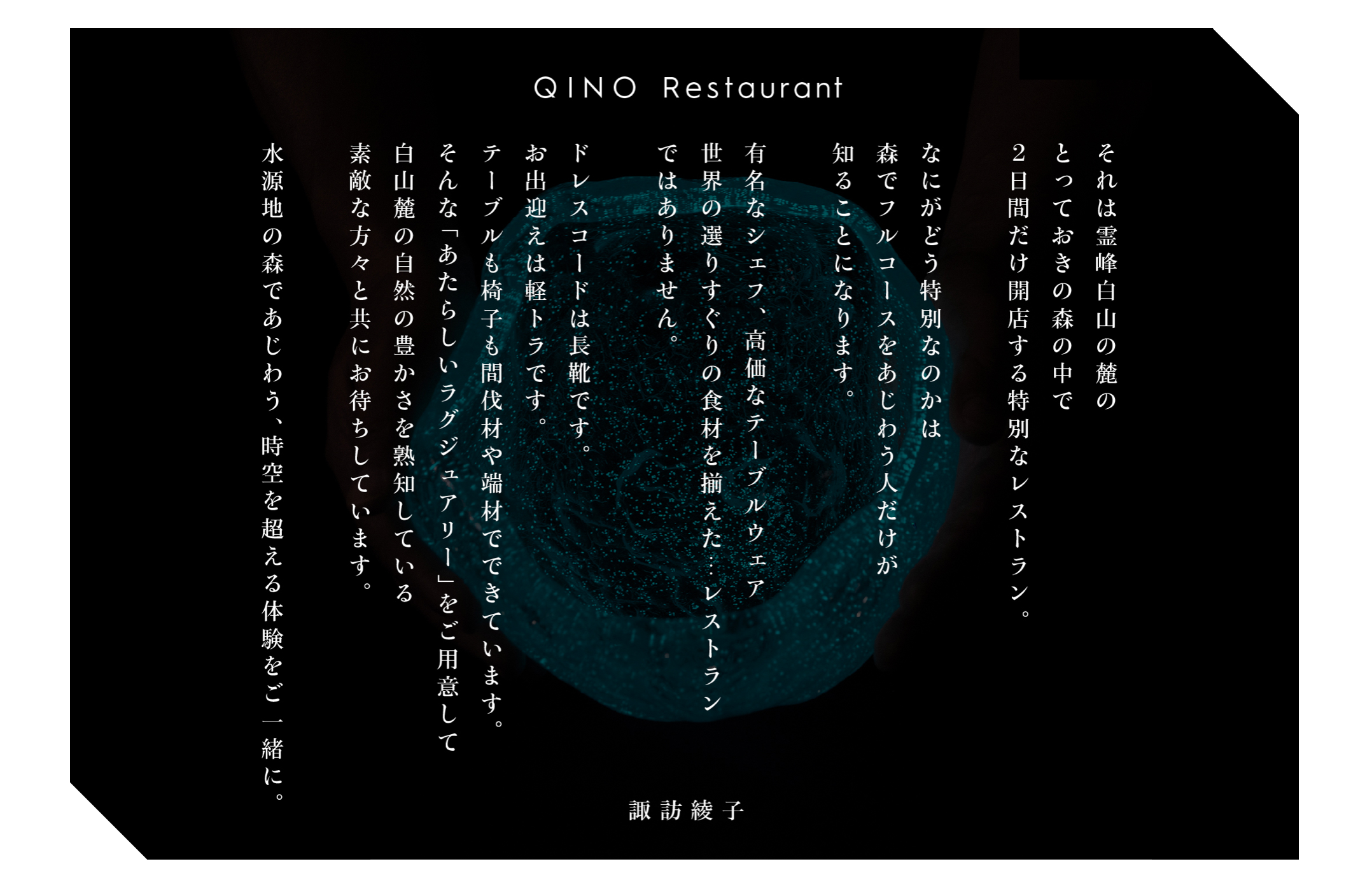「木をあじわい 、水とひとつになる。森のレストラン」をコンセプトにした “QINO Restaurant”。ここで提供されるメニューには様々な表情があります。山に降り積もる雪。雪がとけて大地に浸透していく水。森林の樹木が吸収する水。川の流れに磨かれ浄化される水。伏流水と湧き水。川から海へと注がれる豊かな水。海から蒸発して生まれる雲。これらすべての循環から水は生み出されています。そんな水の循環を食という体験を通してあじわって頂くレストランがQINO Restaurantです。石川県霊峰白山の森を舞台に、7人の地元シェフと世界的アーティストがコラボレーションします。