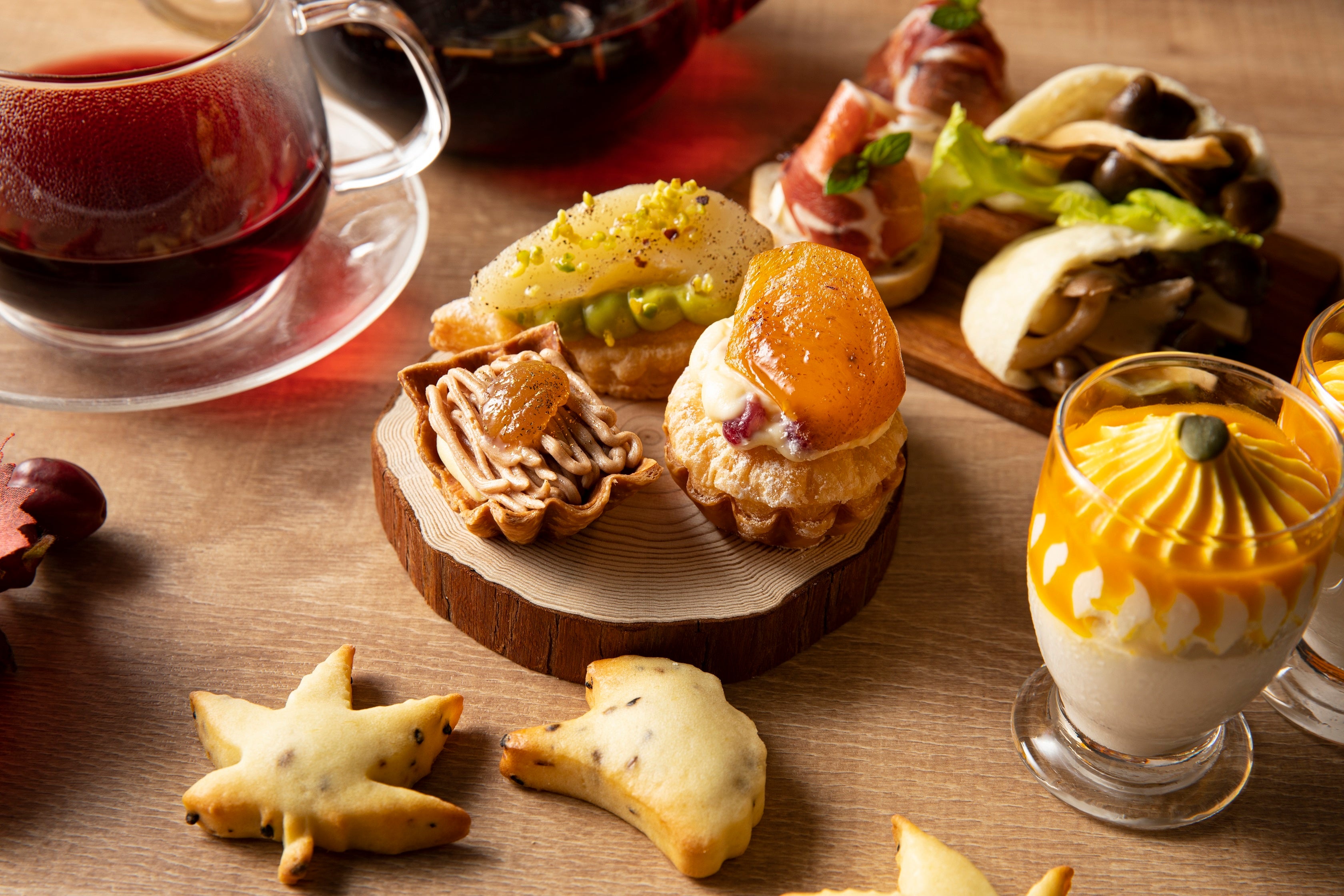 銀杏やもみじの葉を模った「さつまいもと黒胡麻のスコーン」は、甘さ控えめのサツマイモクリームと甘じょっぱいみたらしソースと共にお楽しみいただけます。フレッシュの柿をバルサミコ酢などでコンポートし、ザクロを合わせたデニッシュ「ザクロカスタードクリームの柿デニッシュ」、ドライ無花果を赤ワインで煮込みブリオッシュ生地で包み焼きし、オレンジ色のチョコレートでコーティングしたまるでマッシュルームようなフォルムの「ドライ無花果の赤ワイン煮のブリオッシュ チョコレート掛け」などに加え、かぼちゃを練りこんだパン生地にパンプキンクリームチーズを包み、焼く前にかぼちゃパウダー入りのダッチトッピングを施し、パリパリに仕上げた「パンプキンクリームチーズパン」など、甘さを控えた大人味の秋のお菓子パンの数々をご賞味いただけます。