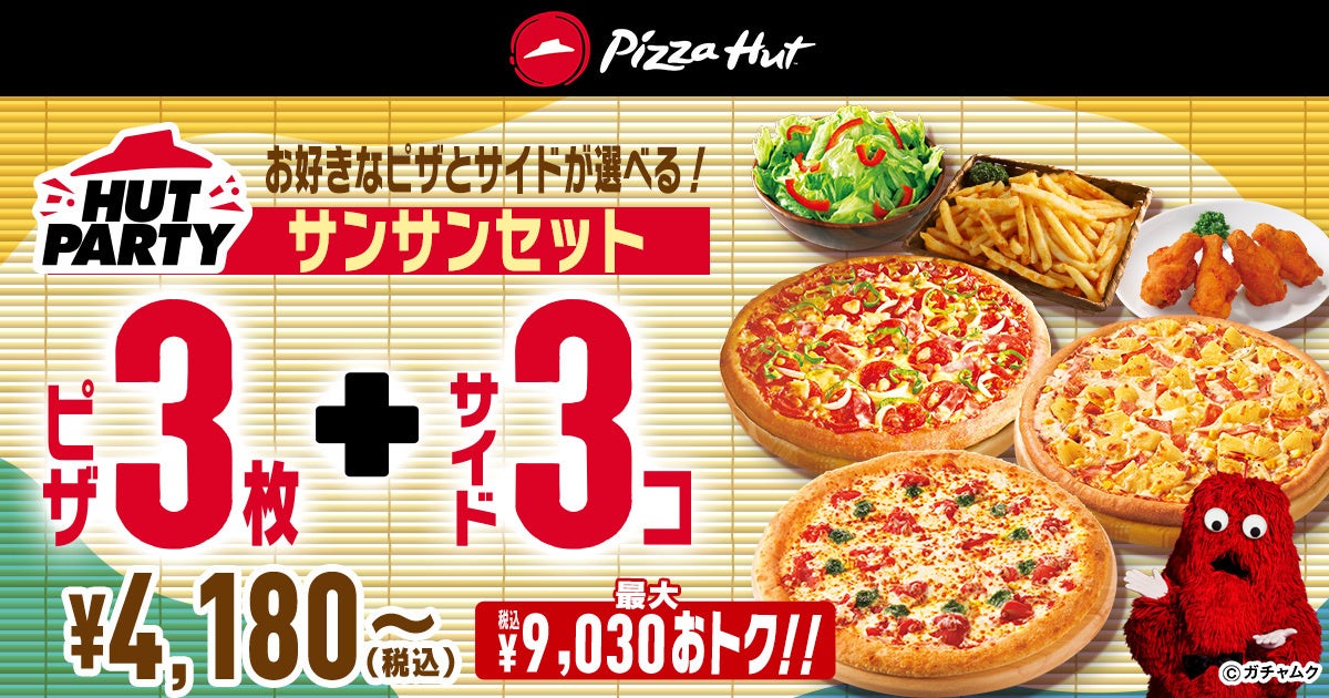 - お盆ウィークのおトクその⑤:最大9,030円おトク!ピザ3枚とサイド3コが選び放題!「お盆サンサンセット」