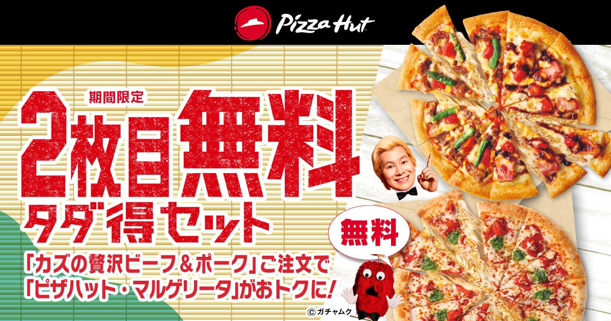 お盆ウィーク限定!「カズの贅沢ビーフ&ポーク」ご注文で「ピザハット・マルゲリータ」が無料になるおトクなセット「2枚目無料 タダ得セット」をご提供!お持ち帰りなら、さらにおトクな特別価格で提供します!