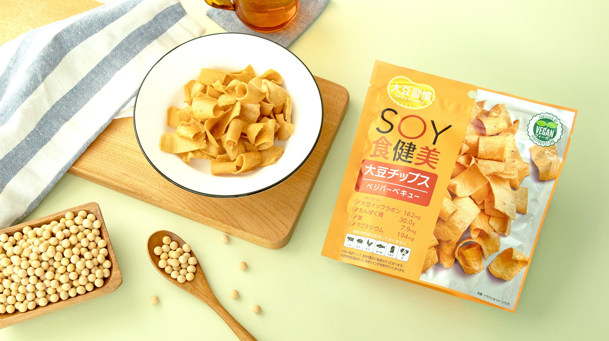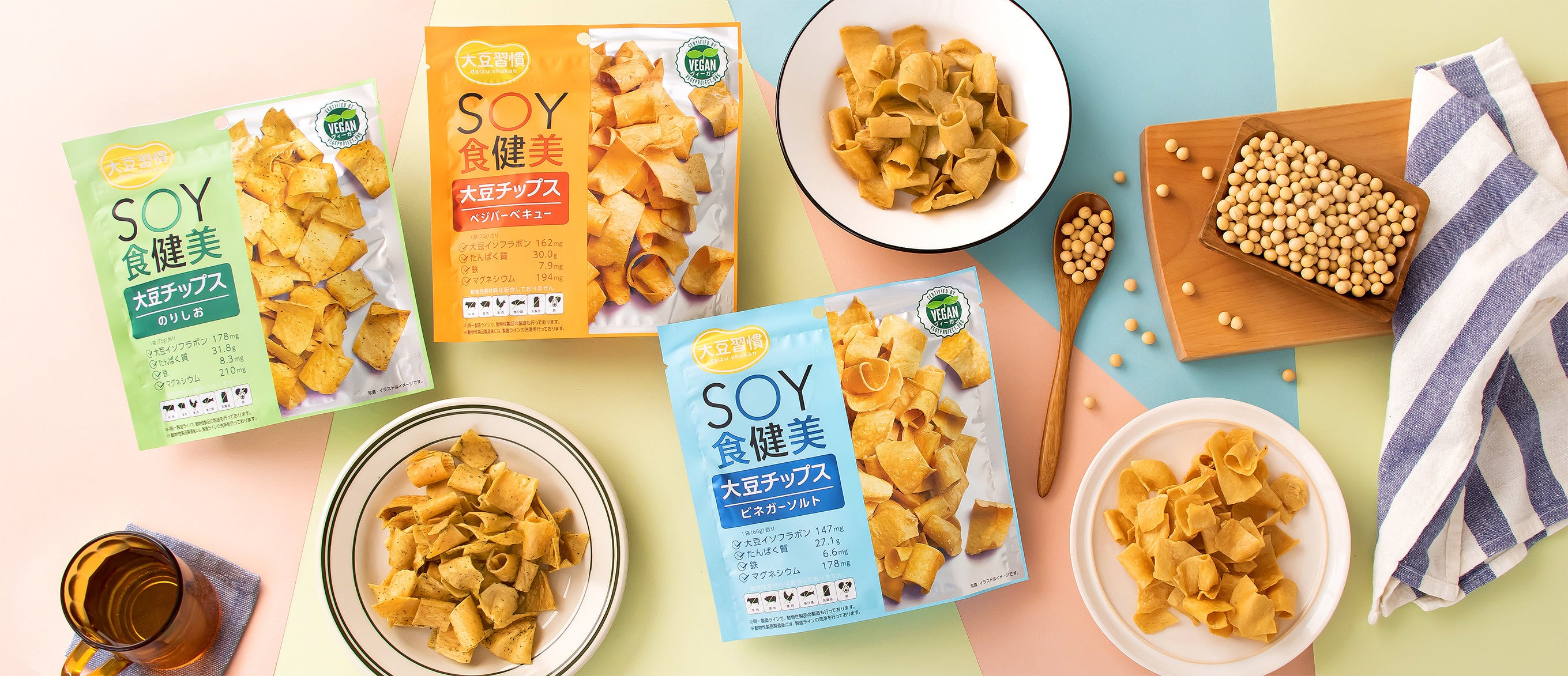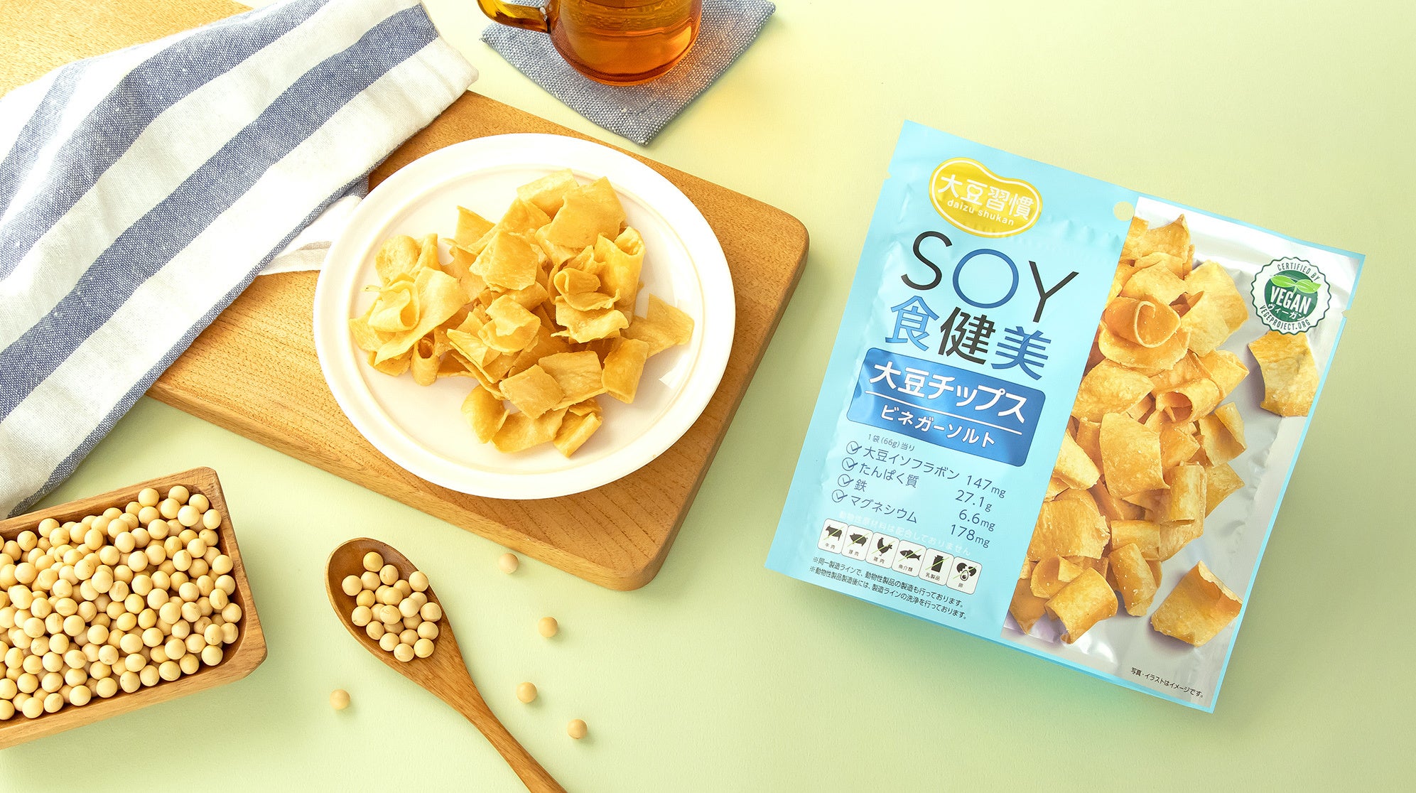 ライフスタイルの多様化が世界中に広まる中、健康意識の高まりから様々な食生活を取り入れる方が増えております。また、当社でも、SDGsを意識する地球環境に配慮した考え方、健康にやさしい選択肢を望まれるお客様のお声を反映した商品企画、商品開発に力を入れております。その中の1つの選択肢として、ヴィーガン認証マークを取得した商品の開発も試みております。「安心安全をわかりやすく訴求した商品をお届けしたい」という思いから、ベジタリアンやヴィーガンの「選択肢」を増やす活動を行っている特定非営利活動法人べジプロジェクトジャパンのヴィーガン認証マークを申請し、2022年5月26日に取得いたしました。大豆のおいしさを活かす「SOY食健美」シリーズには、同じく、ヴィーガン認証マークを取得した豆菓子のシリーズがあります。今回の新商品 3種類は、大豆のおいしさを別の角度からも表現したいという思いから大豆チップスといたしました。