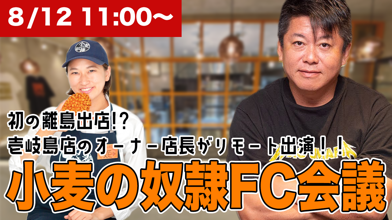 8月12日(金)に、YouTube【ホリエモンチャンネル】にて「小麦の奴隷FC会議」をライブ配信します。今回も「小麦の奴隷LABO 自由が丘」よりお届けします。