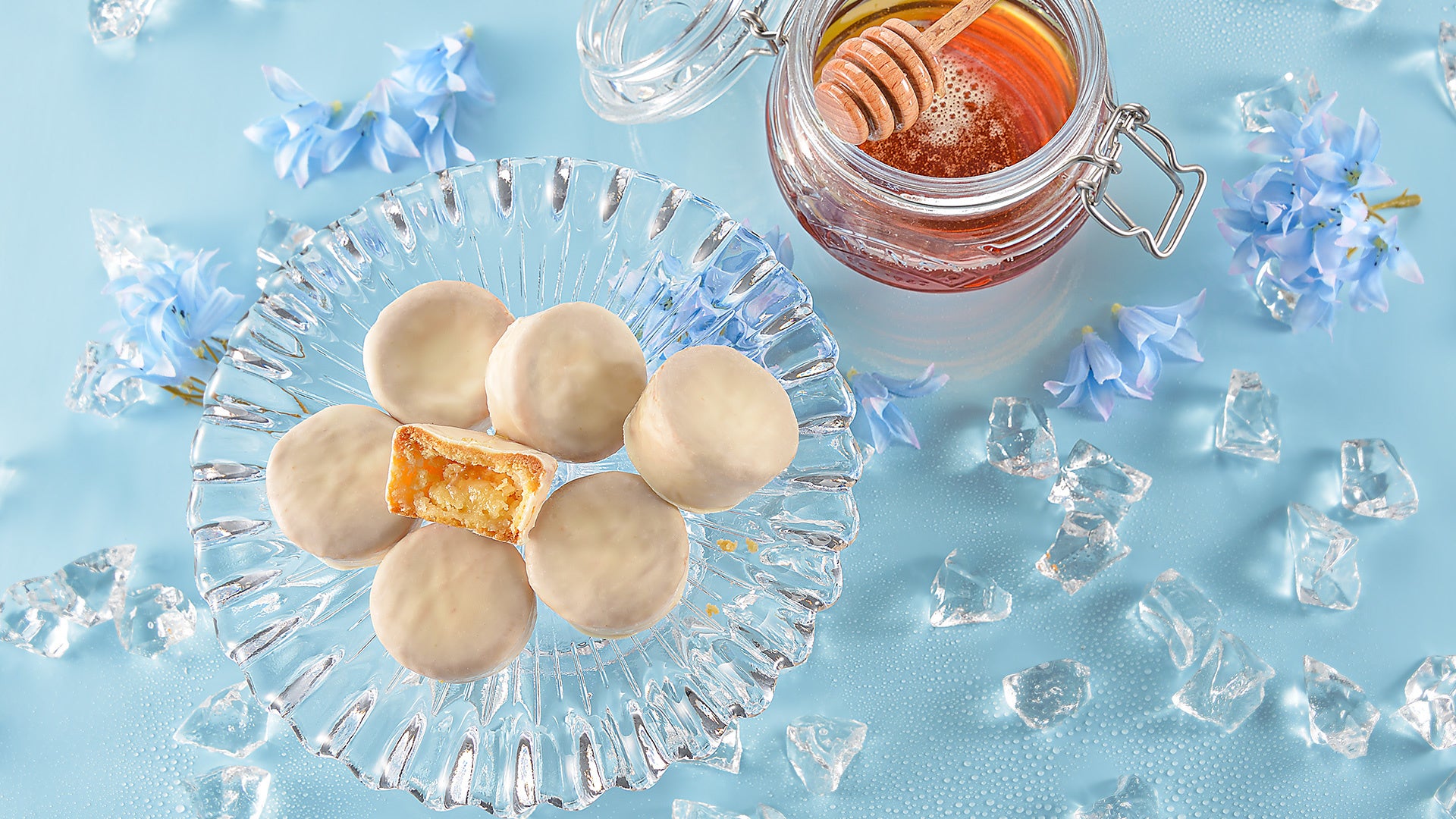 ホワイトチョコでコーティングし、さらに口どけよく仕上げました。