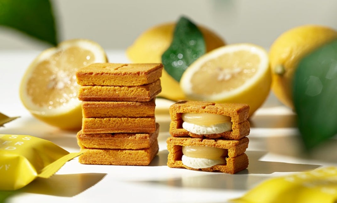 瀬戸内産のレモンを、クッキー、バタークリーム、バターキャラメルすべてに使用した、レモンの果実をまるごと感じて頂けるバターサンドです。クッキー生地にはレモンピールパウダーを練り込み、ひとつひとつ丁寧にプレスして焼き上げました。バタークリームにはレモンの皮を刻んだレモンゼスト、キャラメルペーストにはレモンの果汁をペースト状にしたレモンカードをミックスし、2層をサンドしています。