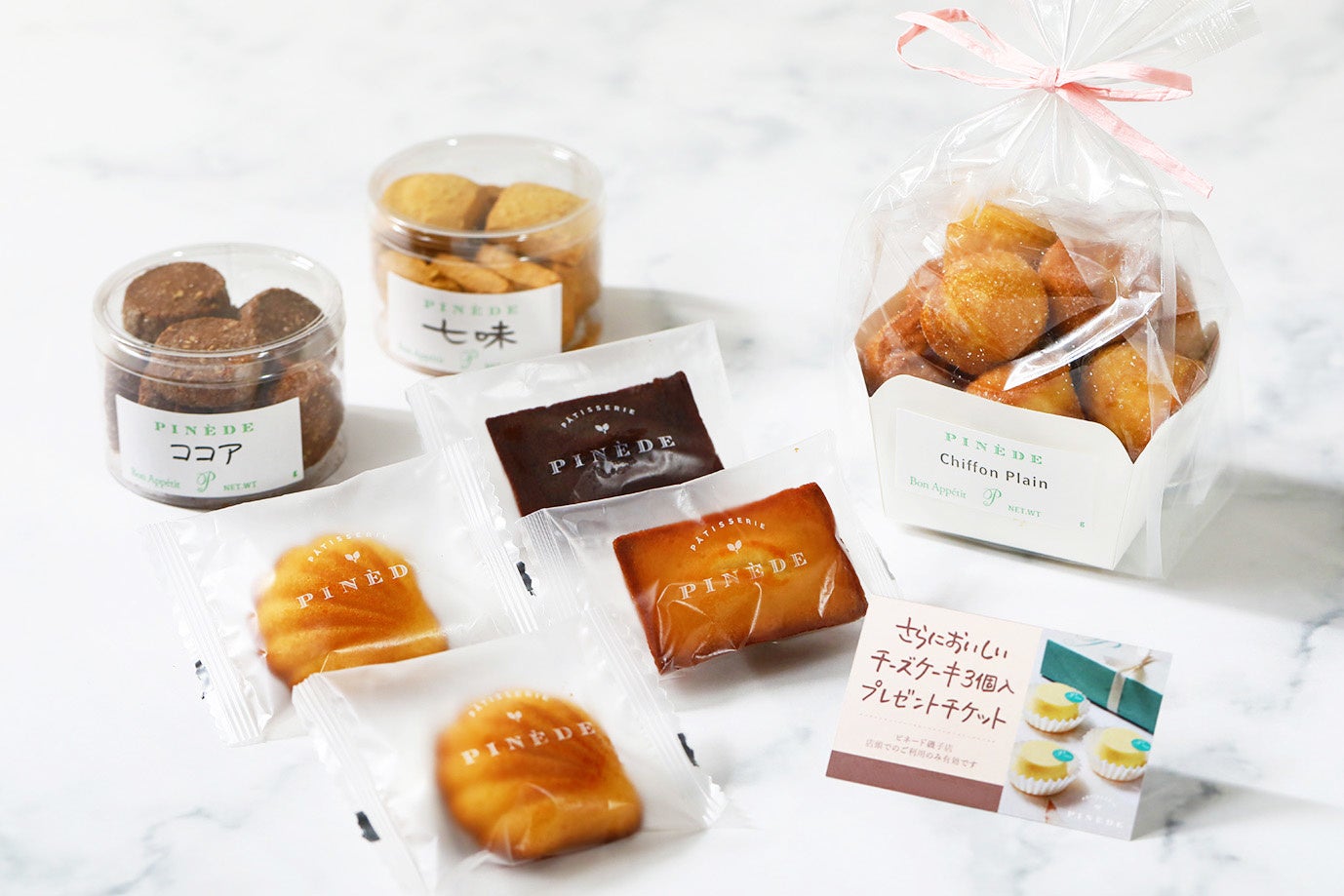 ひと口食べるとクセになる“爽やかな辛み”が楽しい「七味クッキー」などのピネード人気焼き菓子を詰め合わせました。焼き菓子に加え、次回のご来店でご利用いただける「さらにおいしいチーズケーキ」の3個入りプレゼントチケットが入ったオープン記念セットです。