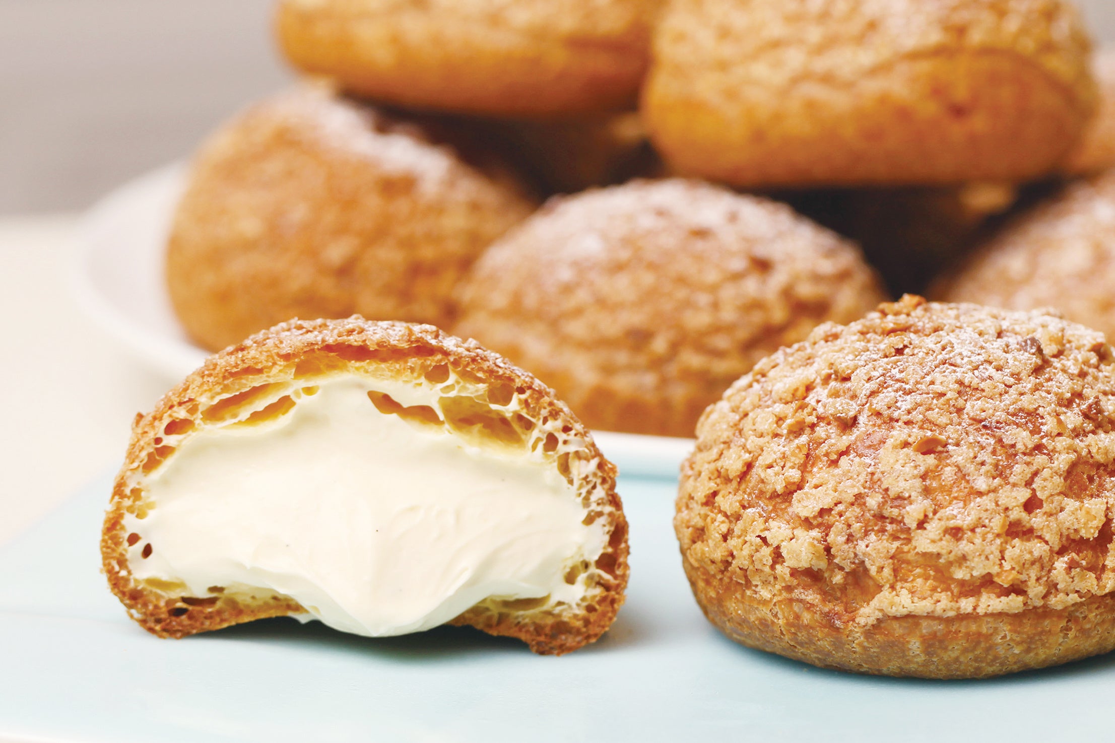 シュー皮の上に刻みアーモンドとクッキーを乗せて焼き上げ、中にはカスタードクリームとホイップクリームを合わせた濃厚なクリームを詰めました。おやつにはもちろん、訪問の際のお手土産やギフトにもご利用いただける定番のシュークリームです。